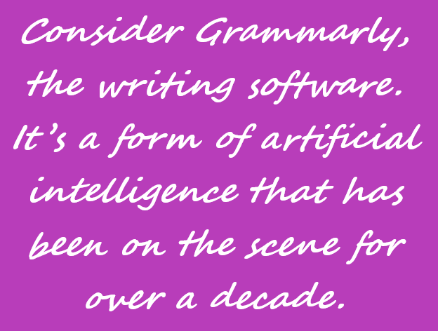Consider Grammarly, the writing software. It’s a form of artificial intelligence that has been on the scene for over a decade. Unlike a simple spell-check that searches for misspelled words, it considers the CONTEXT in which each sentence was written. It seeks to understand what an author is trying to convey.